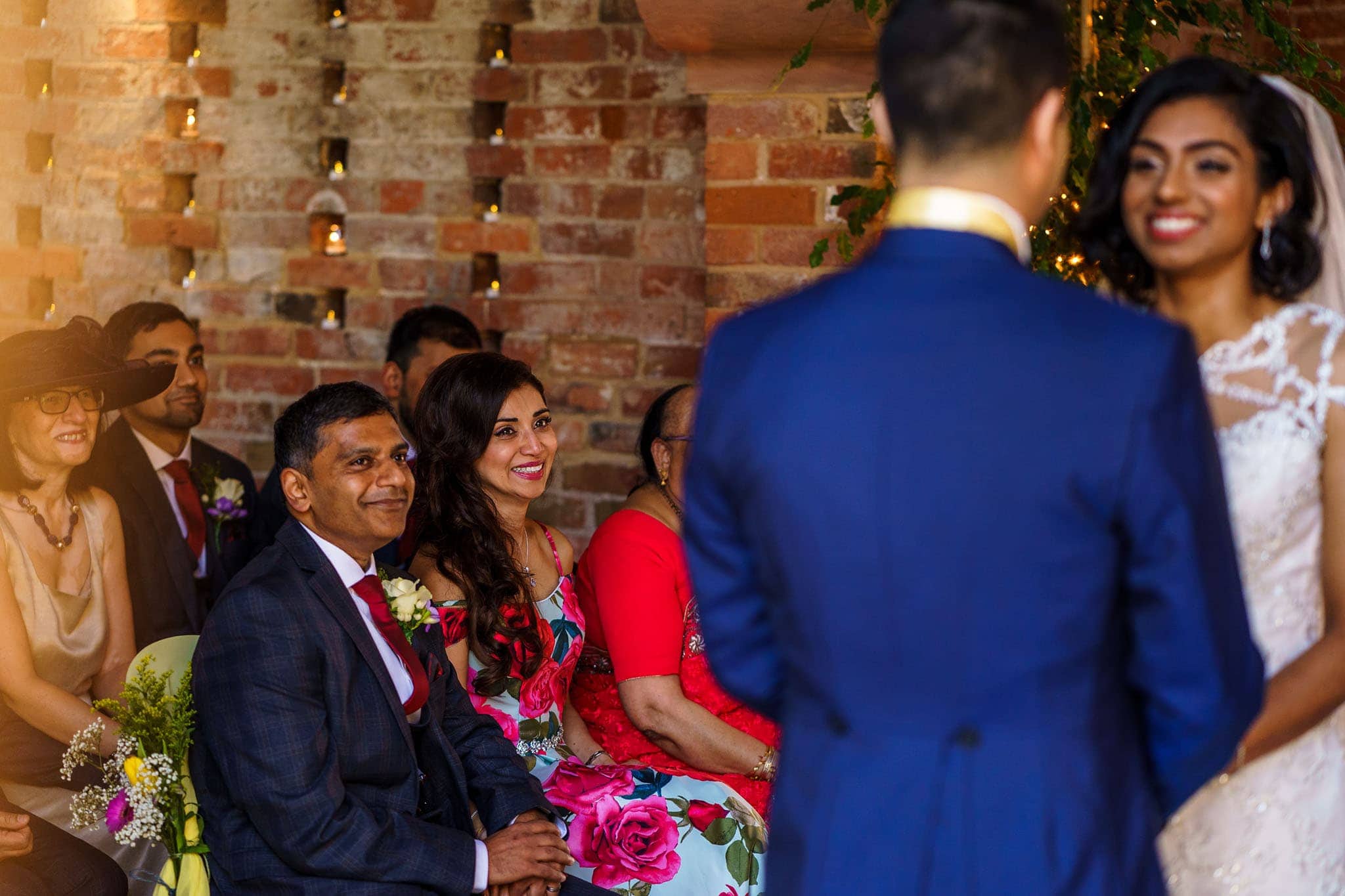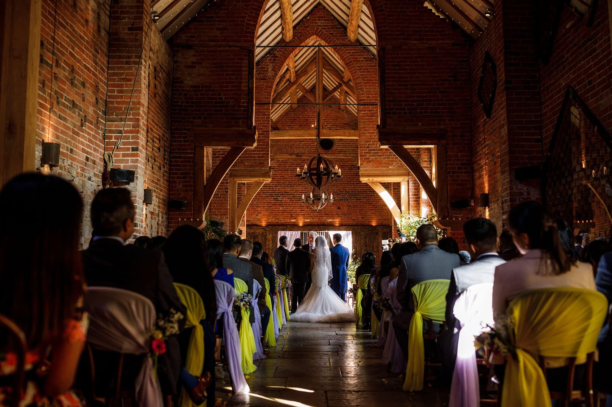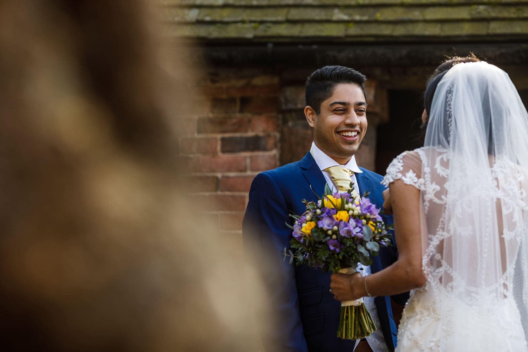 The morning had started off with a thick fog but by the time we arrived at Shustoke Barn for the ceremony the sun had started to come out and it was actually a fairly warm winter’s day. Before the ceremony Jem and Anish did a ‘first look’ – the first time I’d shot this but I love something different on a wedding day. They organised the day with plenty of time to get everything done so there was no rush before the ceremony.