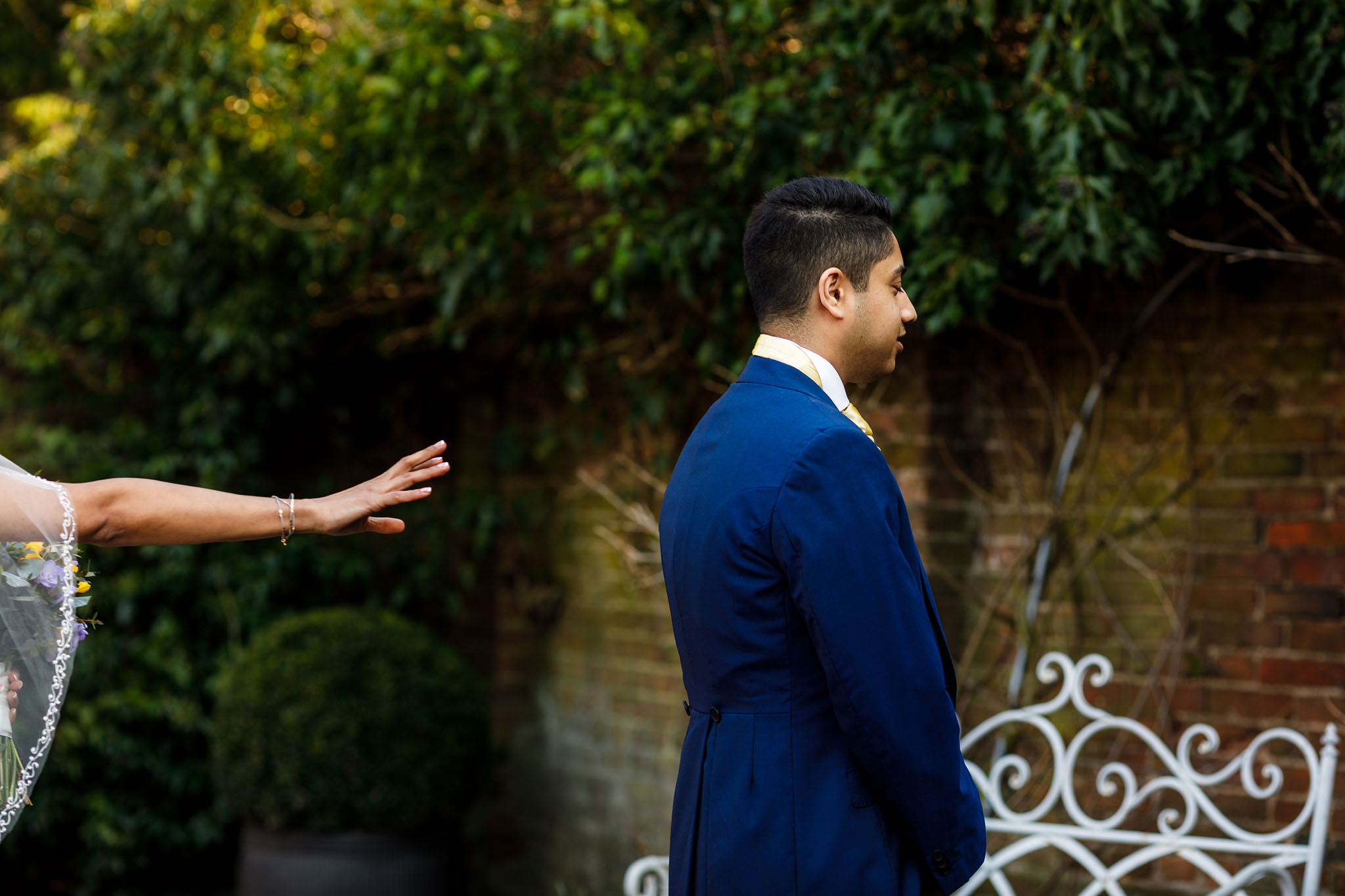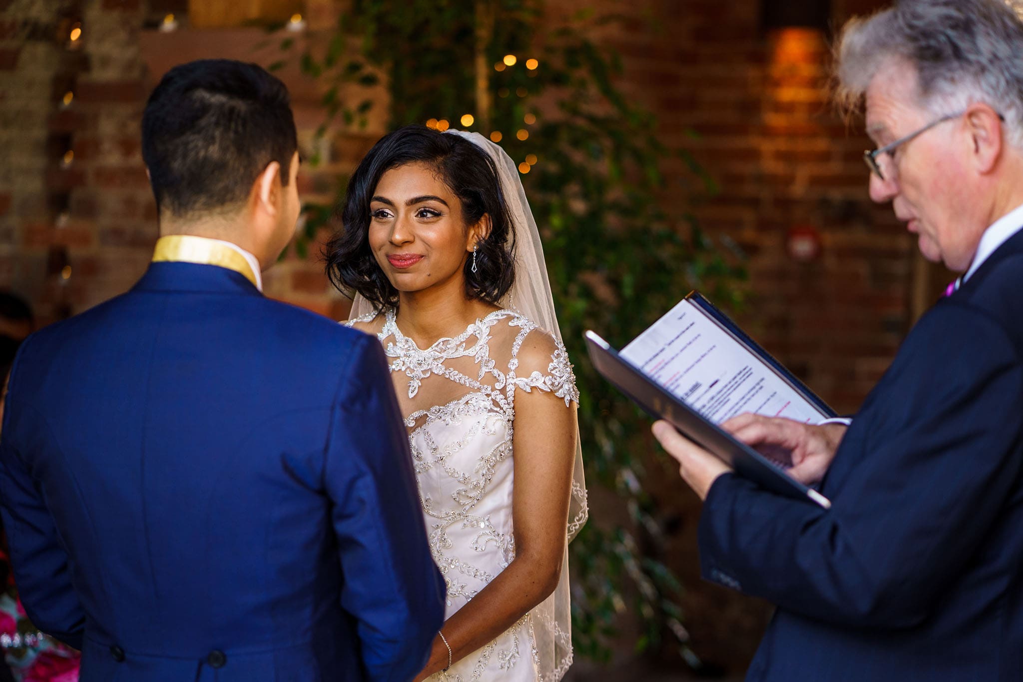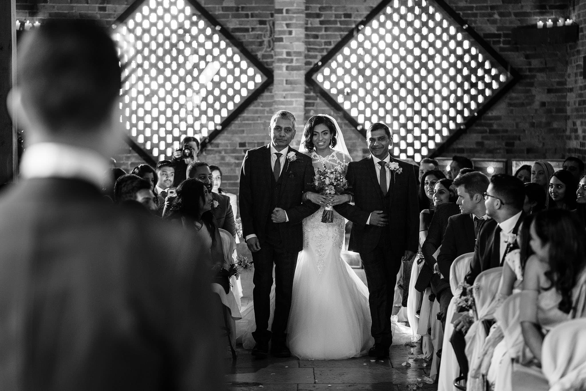 The morning had started off with a thick fog but by the time we arrived at Shustoke Barn for the ceremony the sun had started to come out and it was actually a fairly warm winter’s day. Before the ceremony Jem and Anish did a ‘first look’ – the first time I’d shot this but I love something different on a wedding day. They organised the day with plenty of time to get everything done so there was no rush before the ceremony.