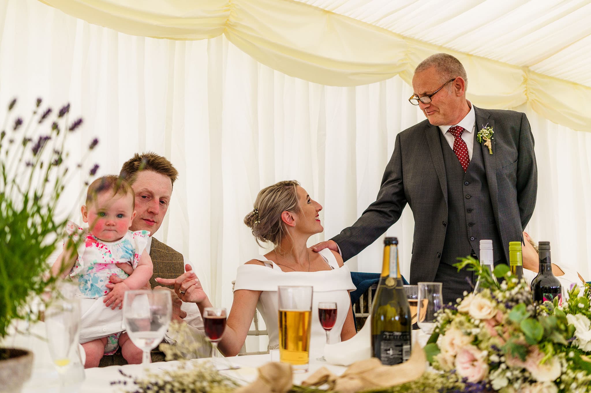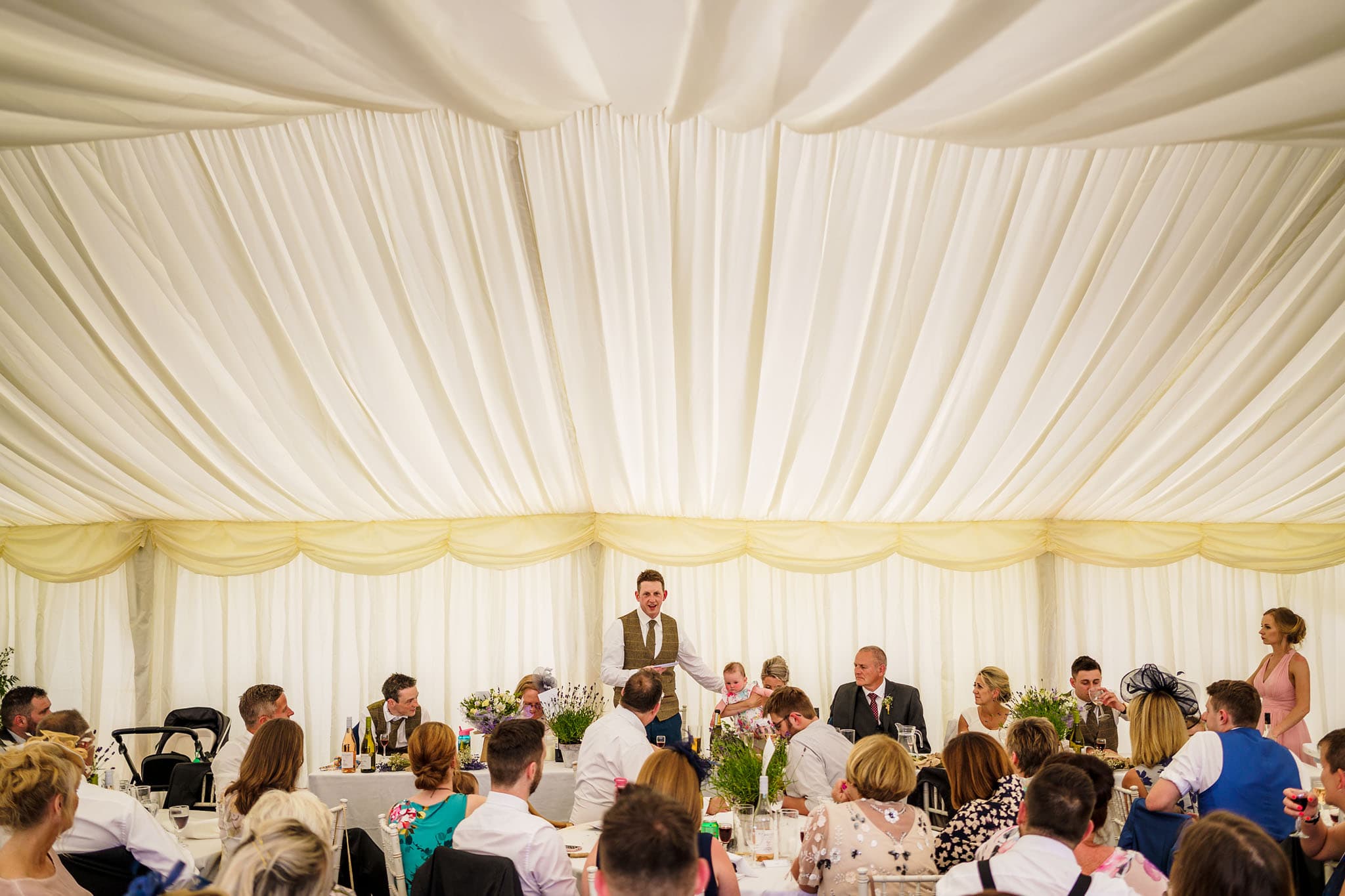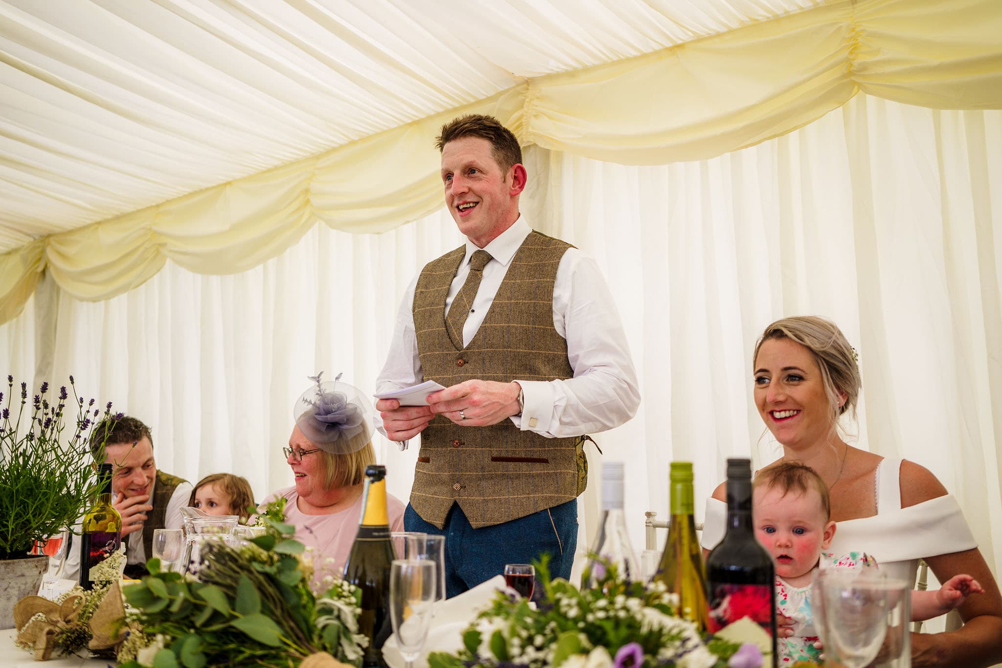 It was a lovely setting with views of rolling hills, and it remained hot and sunny all day! We did a few family photos and then some nice natural portraits of the happy couple together before their wedding breakfast started. The catering from NICuisine was superb I have to say! Some lovely speeches followed and were finished off with Clarissa’s brother leading a game of heads and tails to get everyone involved.