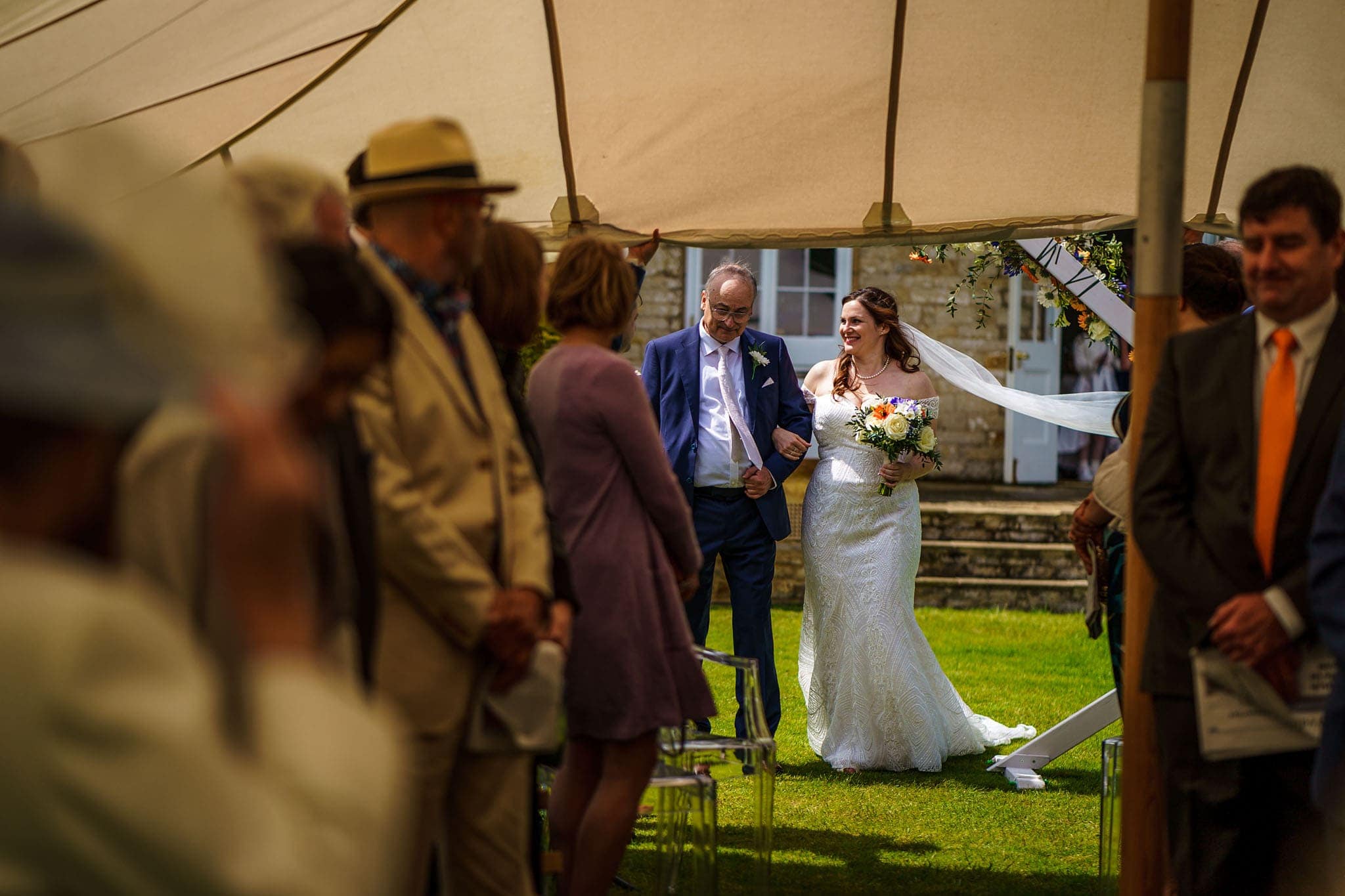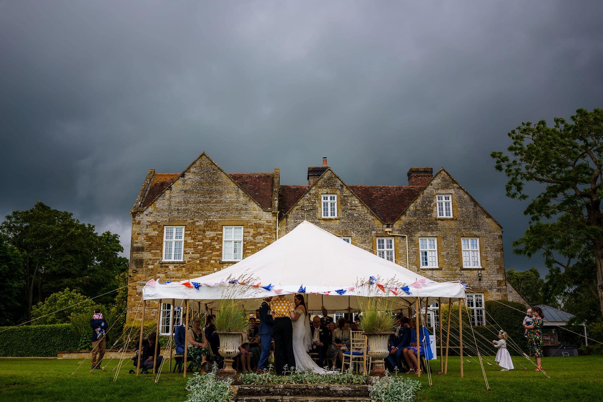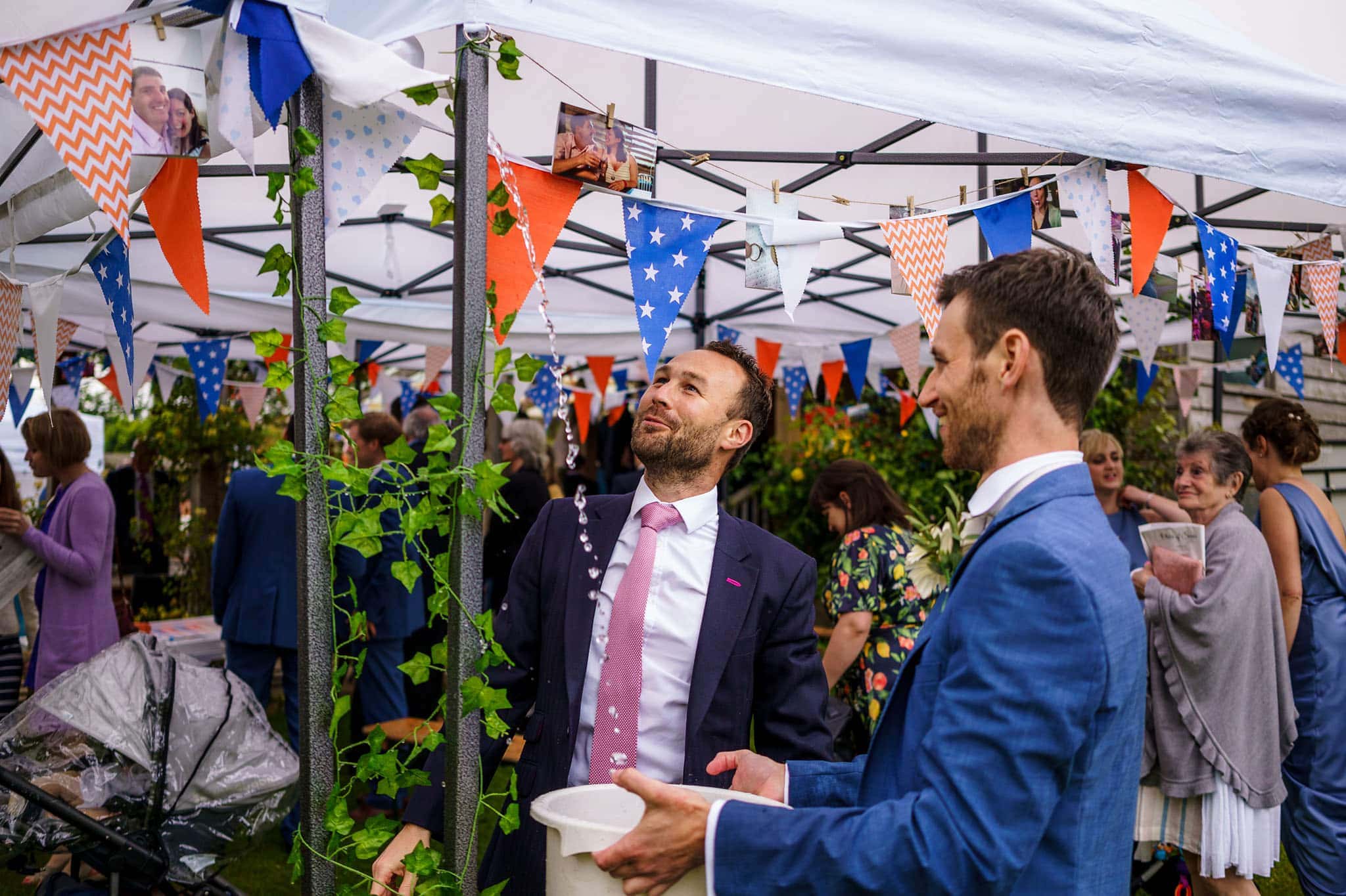 They had an outdoor ceremony, although sheltered under an open sided marquee – just as well they had cover as the heavens opened towards the end of the ceremony with a massive down pour. As the weather wasn’t playing ball at the time, the drinks reception started inside Talton House. As soon as the rain stopped, we popped outside for some family group shots and confetti. Then Claire and Will led a procession through to the walled garden where the tipi, the bar and plenty of lawn games were waiting.