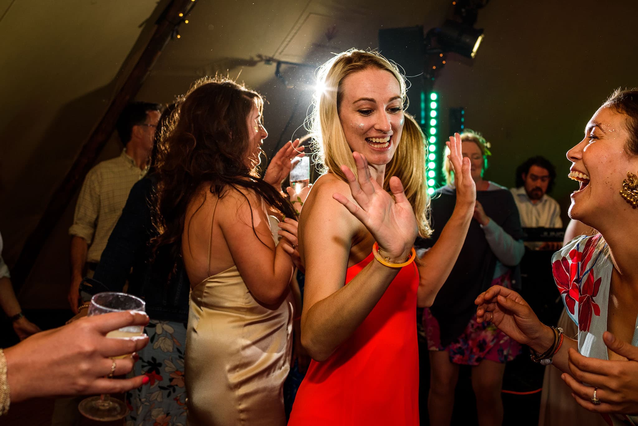 The wedding was held in a field next to Vicks’ parents’ house in Grandborough, Warwickshire. They had two massive tipis setup with a stage in each one for the bands, food vans outside for the wedding breakfast, and plenty of outside space. One of the tipis was setup for the wedding breakfast and had a small stage where they had their first dance and the other had a bigger stage and importantly, a bar!